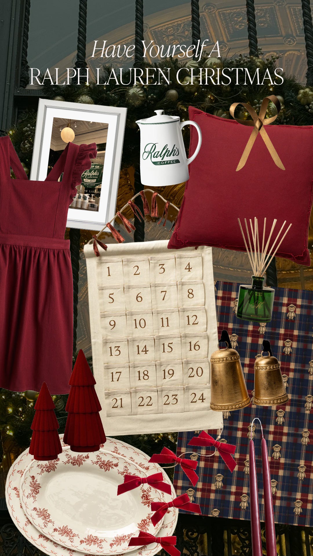 silver frame // deep red ruffle apron // ralph’s coffee beverage server // bow tree topper // deep red pillow covers // gorgeous red floral crockery [I may put this on my Christmas list, tbh!] // red velvet bow garland // linen advent calendar // deep red taper candlesticks // balsam diffuser // navy & crimson plaid teddy bear wrapping // decorative bells